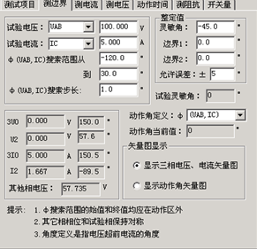 微機繼電保護測試儀的測邊界作者:合眾電氣發布時間:2021-08-16瀏覽量:3824 次字體顯示:【大】【中】【小】 微機繼電保護測試儀的測邊界。 測邊界 自動測試出方向性保護的兩個動作邊界,并且自動計算出最大靈敏角。在“顯示動作角矢量圖”的顯示方式下,從主界面右側的圖中可以很直觀地觀察到兩條邊界線和最大靈敏線。上一篇: 微機繼電保護測試儀試驗參量下一篇: 微機繼電保護測試儀測試項目的界面說明