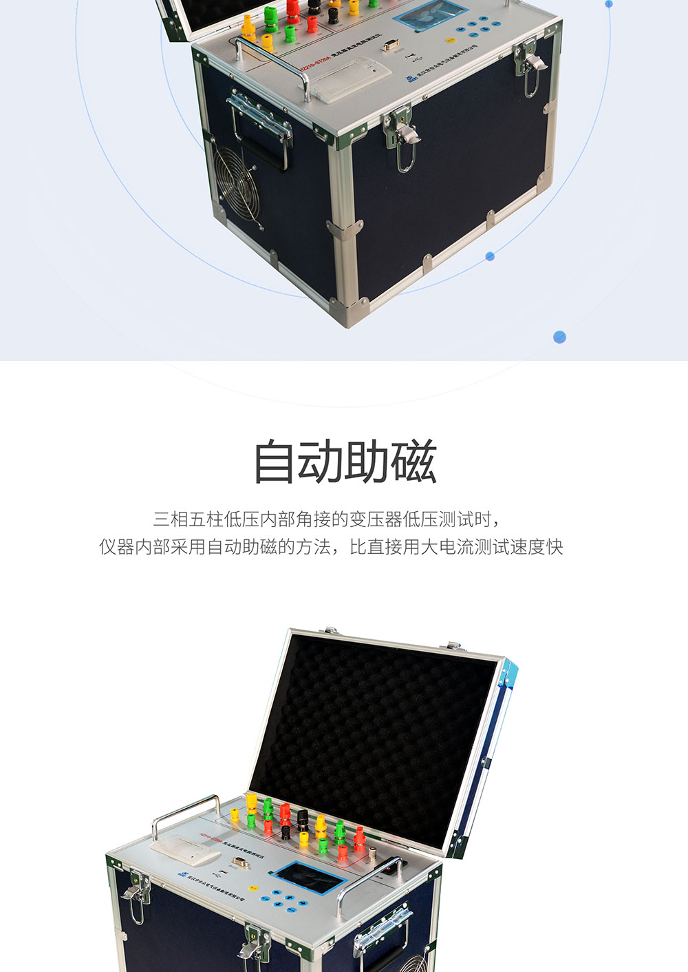 3、三相五柱低壓內(nèi)部角接的變壓器低壓測(cè)試時(shí),儀器內(nèi)部采用自動(dòng)助磁的方法,比直接用大電流測(cè)試速度快;